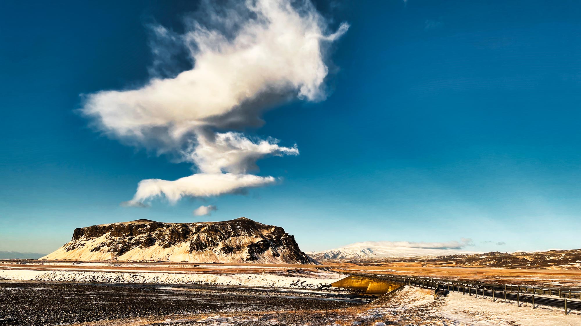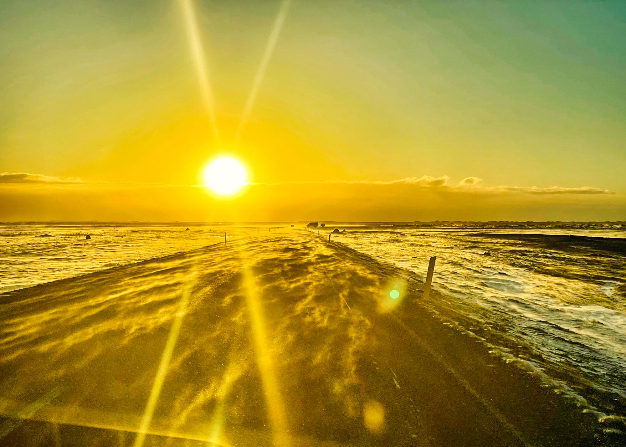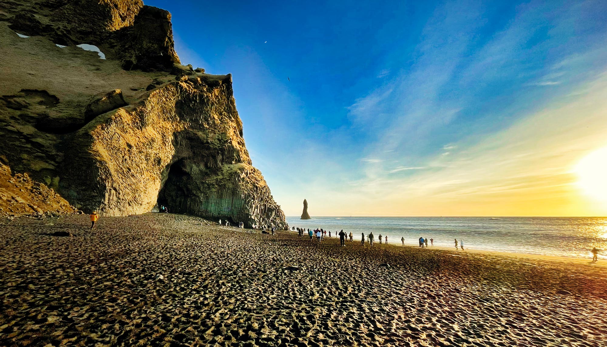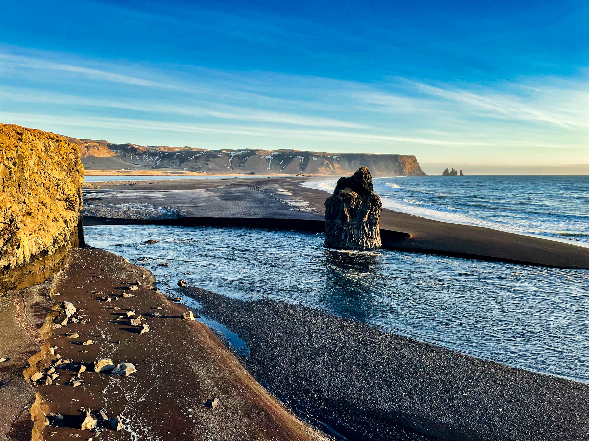Auf der Halbinsel von Dyrhólaey thront ein schneeweißer Leuchtturm ganz oben oberhalb der einzigartigen Klippenformation und die Sonne geht quasi direkt hinter dem Felstor auf. An allen Seiten geht es steil hohe Klippen hinunter und tief darunter schlägt die Brandung wild auf die nebenliegenden schwarzen Strände. Da muss man einfach zum Fotoapparat greifen. Das ist überhaupt das Schönste im Winter in Südisland: die Sonne steht einfach immer über dem Meer, auch wenn es bitterkalt sein mag, es ist eine perfekt Kulisse für einen Winterurlaub.