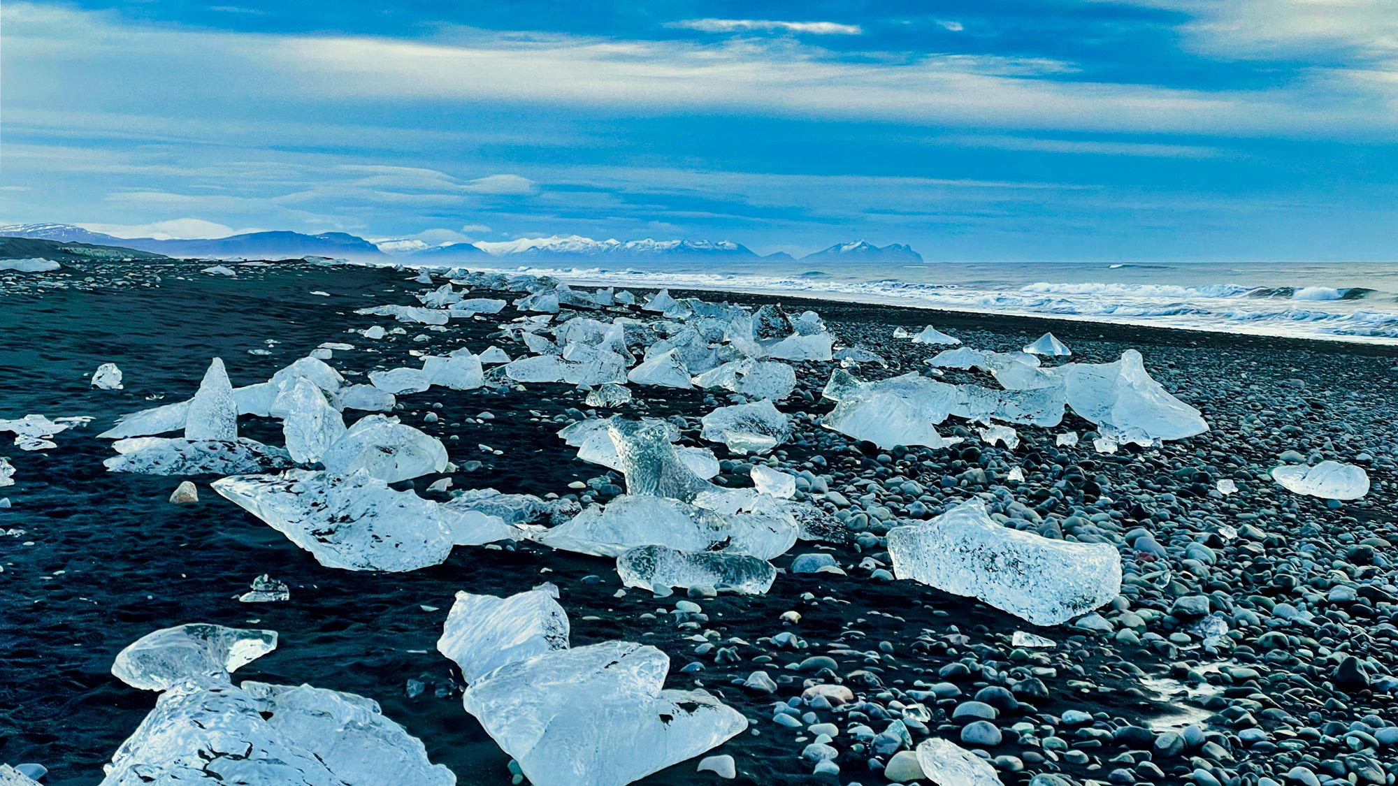 Unser Highlight dieser Reise war die Gletscherlagune Jökulsárlón mit dem daneben liegenden Diamond Beach. Dieser ebenso schwarze Strand hat diesen Namen, weil die ganzen Eisbrocken aus dem Gletschersee dort angespült werden und wie Diamanten dort am Strand herumliegen. Diese sind teilweise mannshoch und bieten auch eine einzigartige Erfahrung – Sommer wie Winter. Die Gletscherlagune ist voller riesiger Eisschollen teilweise aufgestellt und türkis bis tiefblau. Hier sieht man oft Seehunde zwischen den Eisbergen auftauchen, man sollte sich also ein bisschen Zeit nehmen und diese Atmosphäre einsaugen.