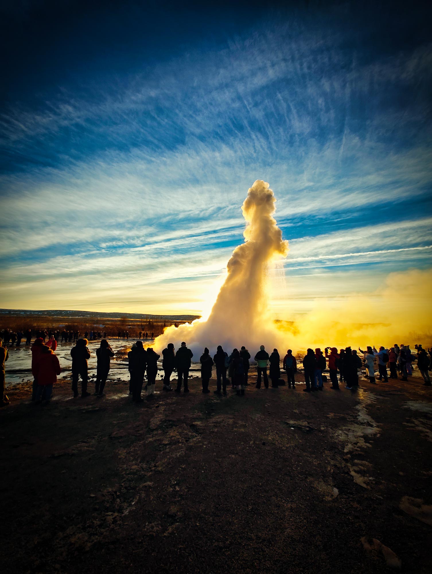 Da Gunnar noch nicht auf Island war, wollten wir auch den Süden Islands nicht auslassen. Wir hatten zwar erwartet, dass im Winter weniger los sei, auf den Straßen merkte man auch kaum etwas vom Verkehr, aber an den Touristen-Hotspots tummelten sich doch auch außerhalb der Hochsaison und der Ferienzeiten erstaunlich viele internationale Touristen. Besonders am sogenannten Golden Circle, der bekanntesten Sightseeing-Route in Island, den wir am ersten Tag erkunden wollten, musste man sich schon einen Platz in der ersten Reihe vor dem Geysir Strokkur erkämpfen, um nicht nur die Spitze des Geysirs aufs Foto zu bekommen.