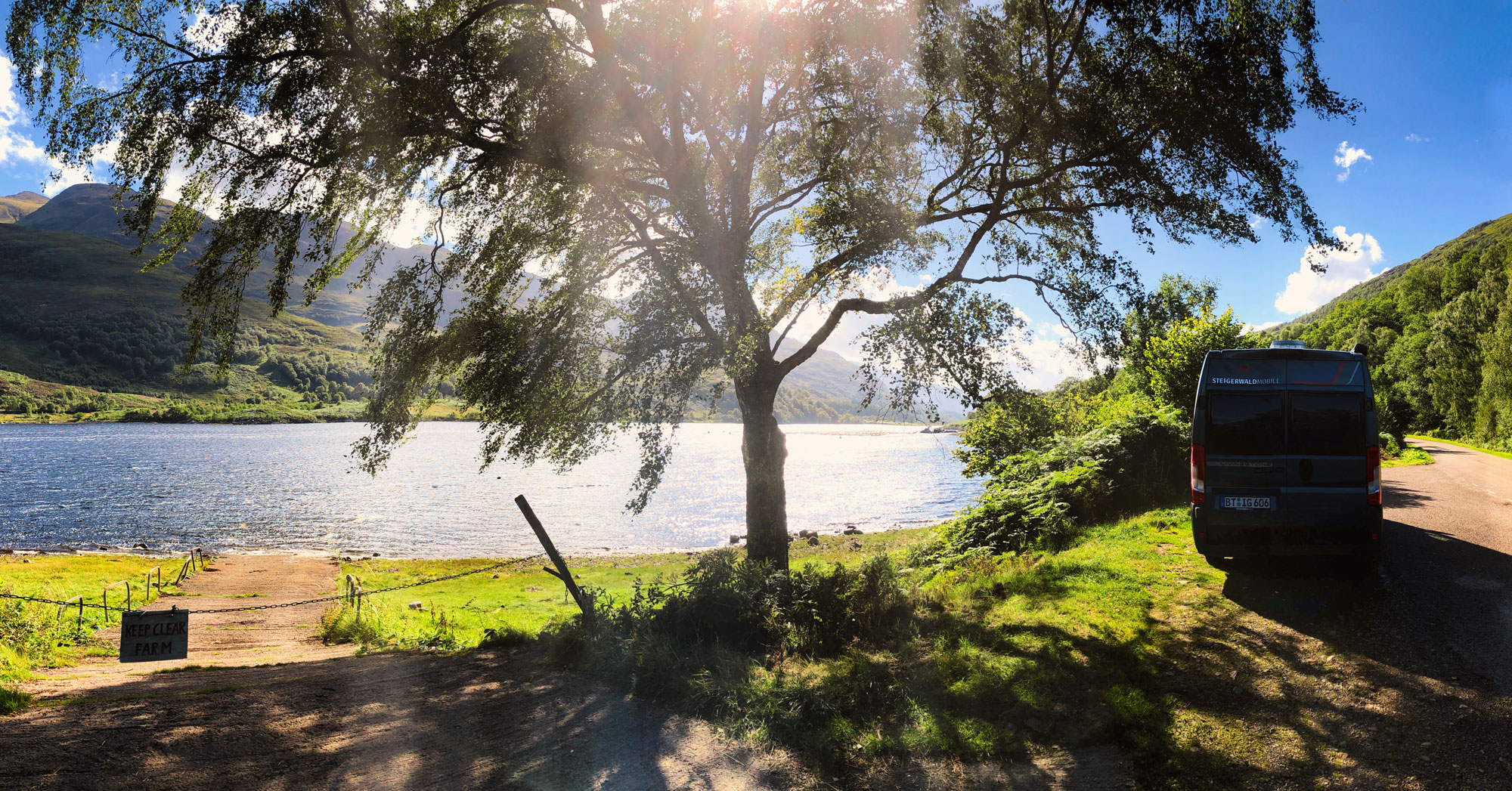 In Schottland hingegen gibt es – ähnlich wie in England auch – Parkplätze oder Straßenbuchten, auf denen man mit etwas Glück wunderschön stehen kann. Diese haben aber keinerlei Service und auch richtige Campingplätze mit Grauwasserablass wie wir es kennen, haben wir bisher noch nicht gesehen. Und so müssen wir circa einmal die Woche zu einem Campingplatz, um wegen Entsorgung anzufragen, mal bleiben wir auch dort über Nacht und nutzen die Gelegenheit und gönnen uns eine Extra-Ration Strom für unsere Kamera-Akkus oder/und eine heiße Dusche.
