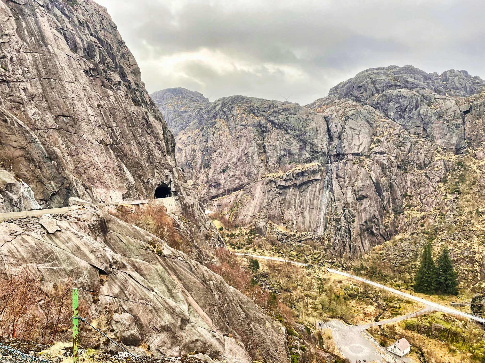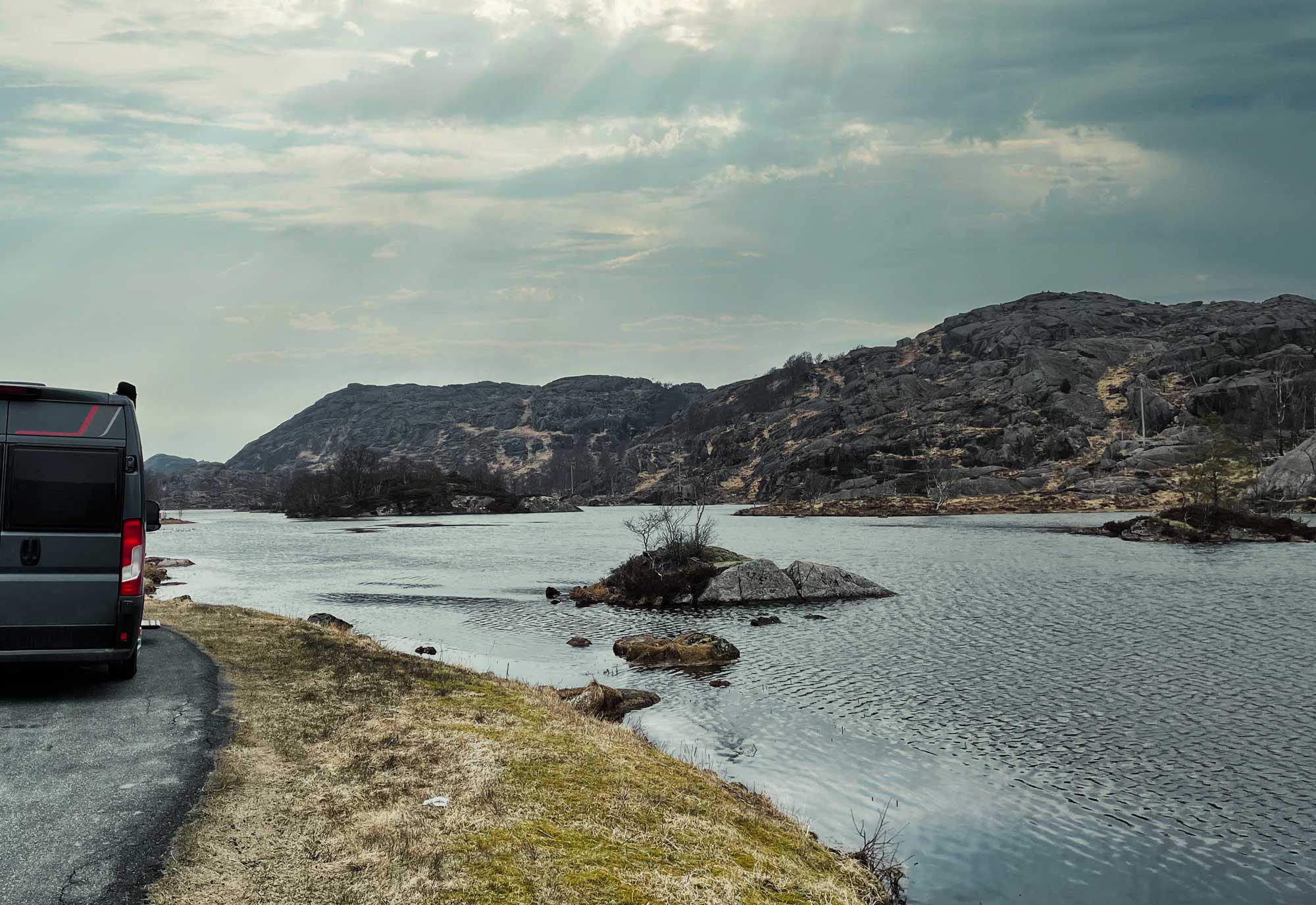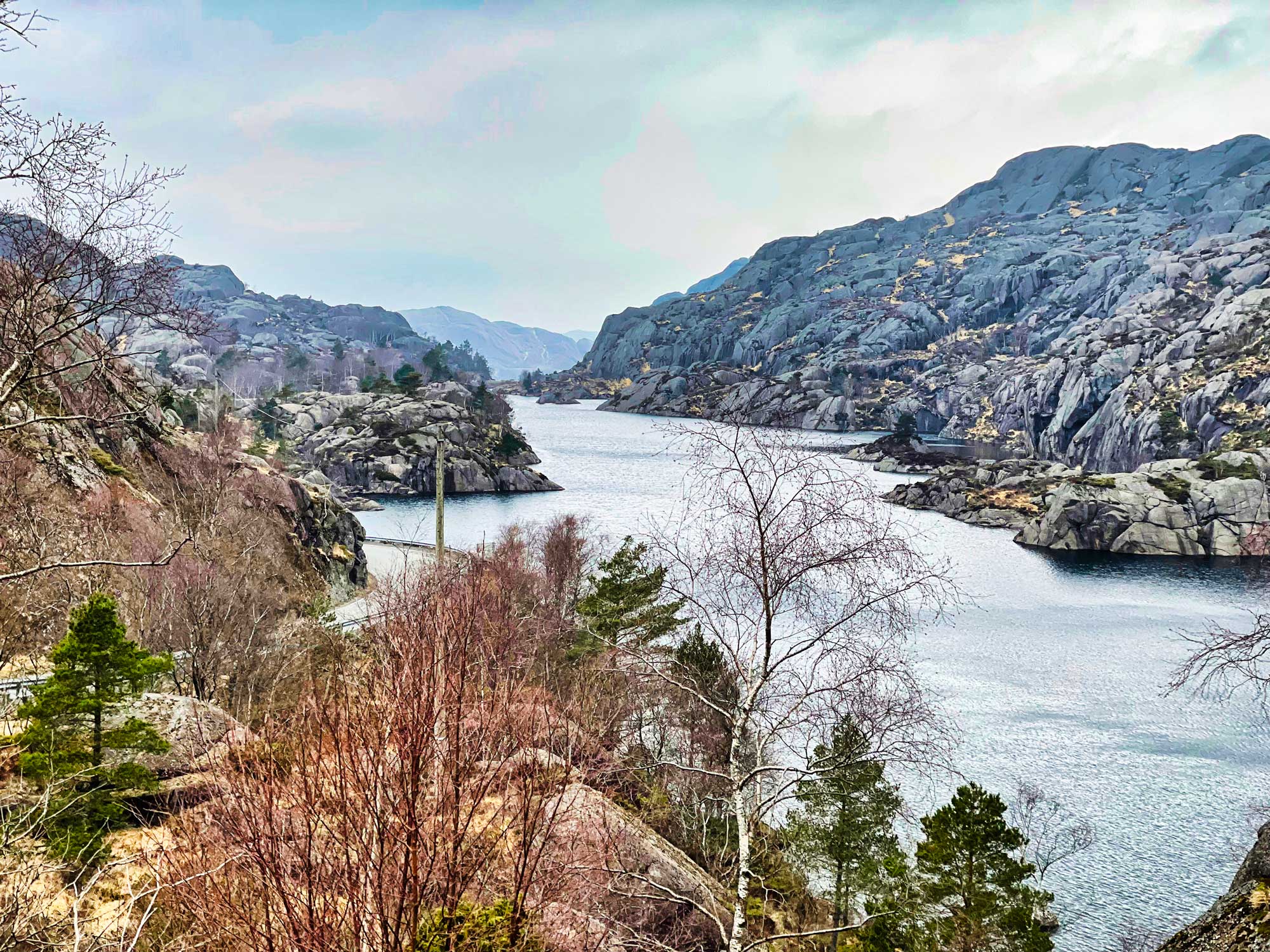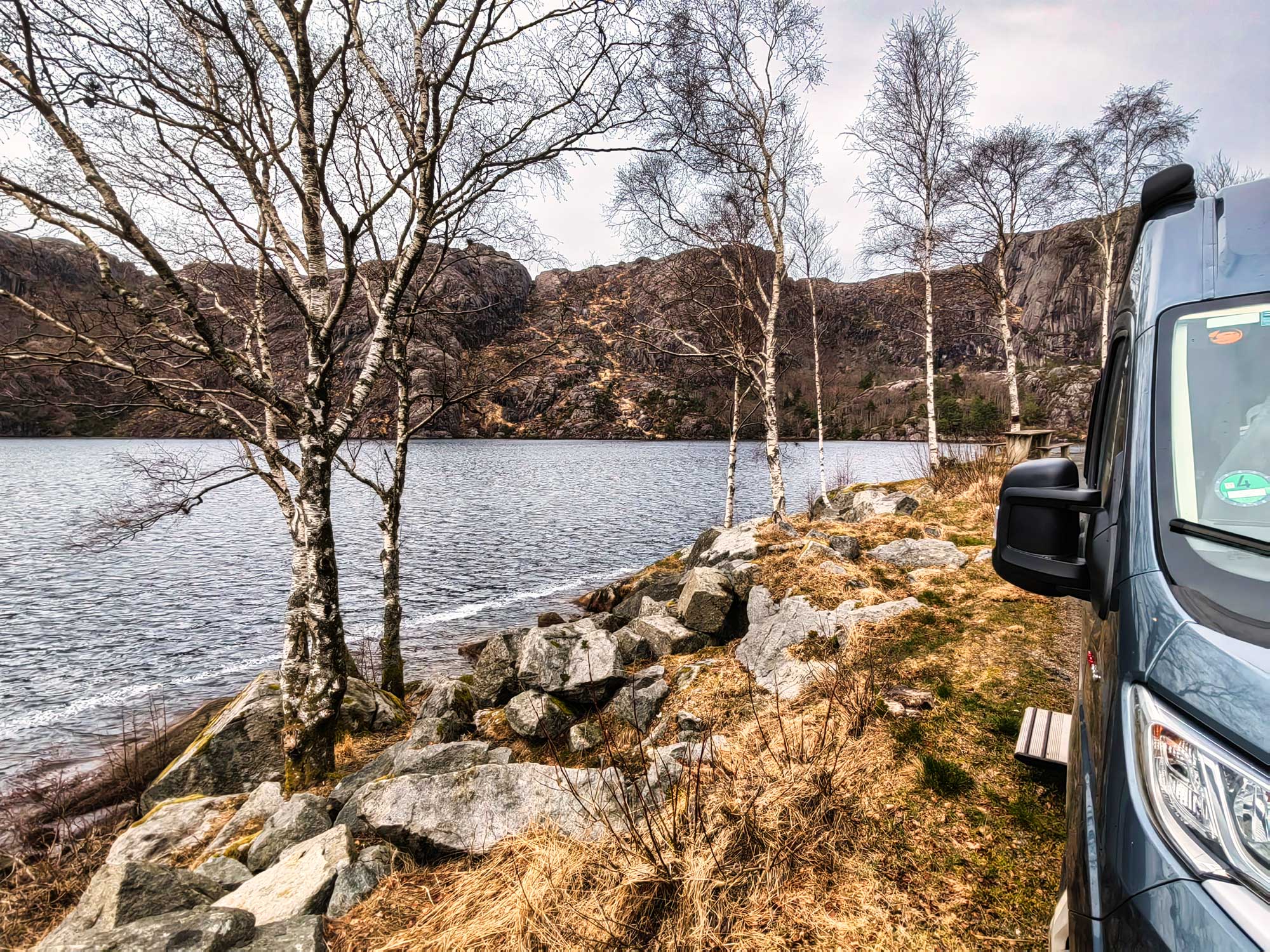 Wir planen ja meist nicht wirklich unsere Route, deshalb sind wir in diesem Fall sehr dankbar für den Tipp eines Norwegers in der Warteschlange an einem Thai-Imbiss im Hafen von Høllen, in welchem wir am Osterwochenende gestrandet sind. Der Norweger konnte wirklich nur ein paar Brocken Englisch und wir ja gar kein Norwegisch, aber er wollte uns unbedingt mitteilen, dass wir in Flekkefjord auf die E44 wechseln sollten, weg von der Hauptroute nach Stavanger. Und da sind wir in diesem Moment – und sehr dankbar für diesen Tipp! Wir zuckeln nun in dutzenden, am Ende sicher mehr als einhundert Serpentinen durch karge Felsmassive, vorbei an kleinen Seen, schönen Gebüschen und zaghaft grünen Nadelbäumen sowie renitenten willensstarken Birken – immer bereit, für unsere erste Elch-Sichtung in Norwegen. Heute morgen, kurz nachdem wir wieder über Elche hergezogen sind, hat uns fast ein Reh gerammt, welches aus dem Nichts (rechts war ein Abhang, da ging es steil bergab) über eine 1.50m hohe Betonwand direkt vor uns auf die Straße sprang – wahrlich sehr elegant, muss man dazu sagen. Da traut man seinen Augen nicht! Gut, dass wir in dieser Gegend sowieso im Schneckentempo unterwegs sind, nicht nur weil es eng und kurvig ist, sondern weil es so viele neue Eindrücke abseits der Straße zu verarbeiten gibt.