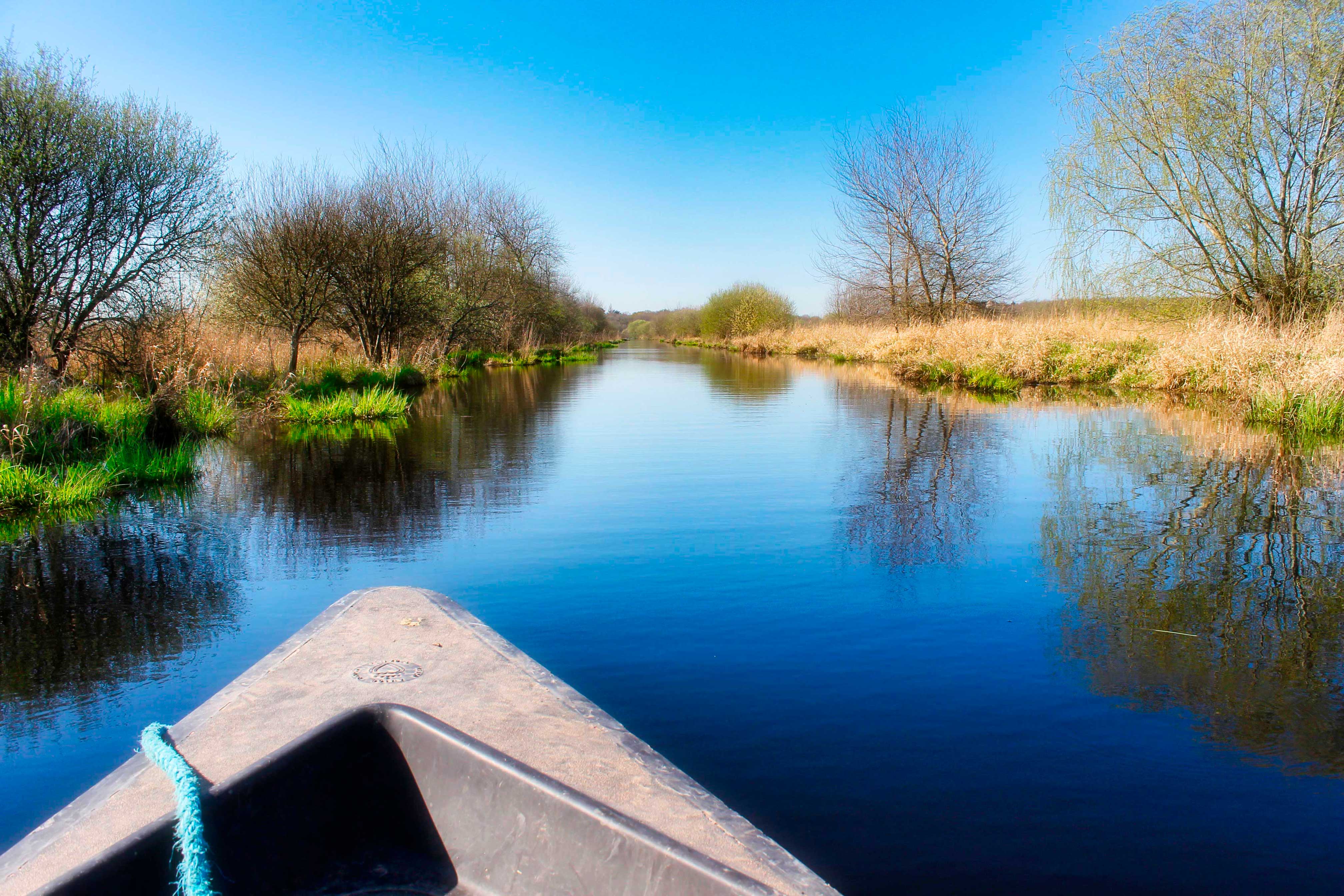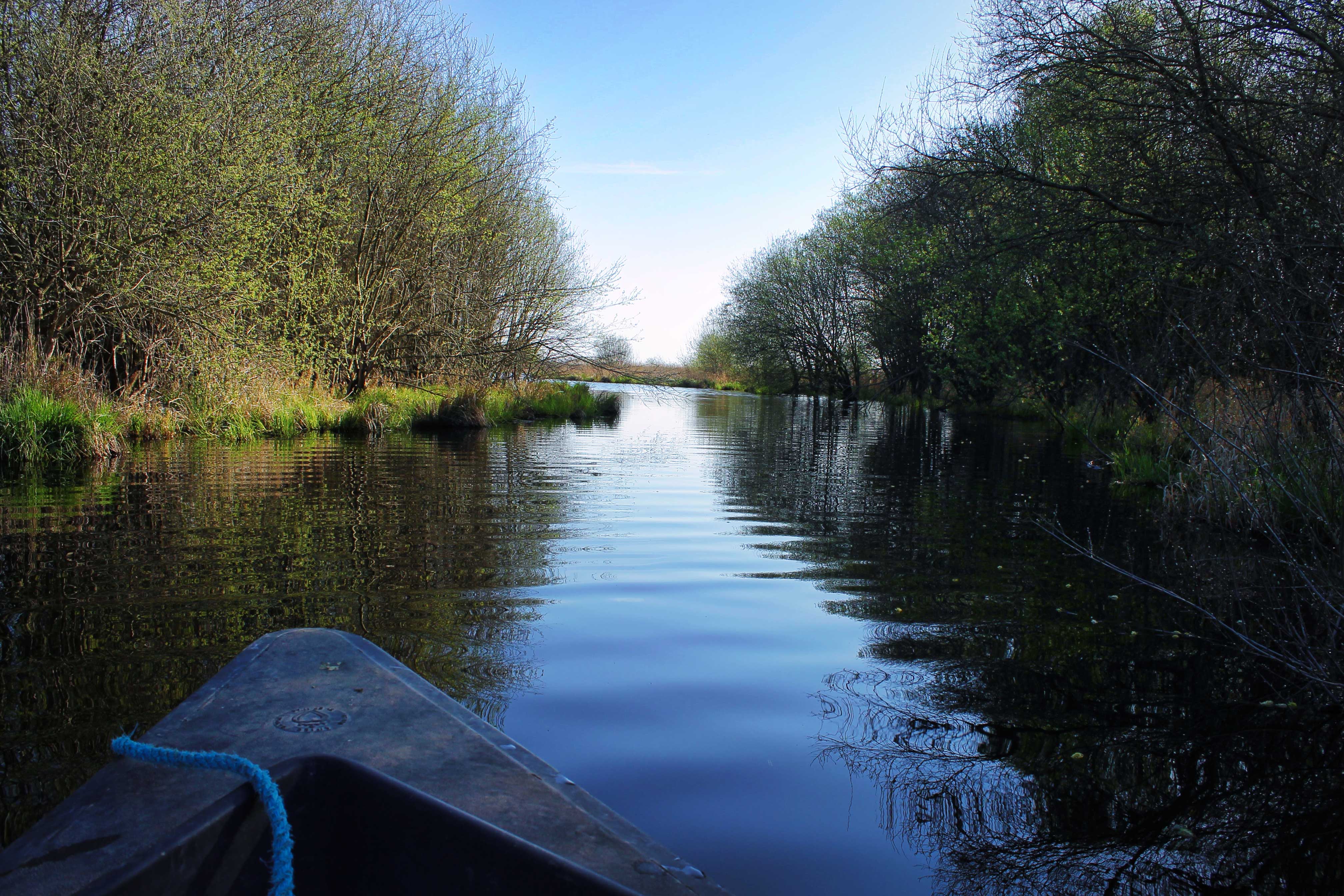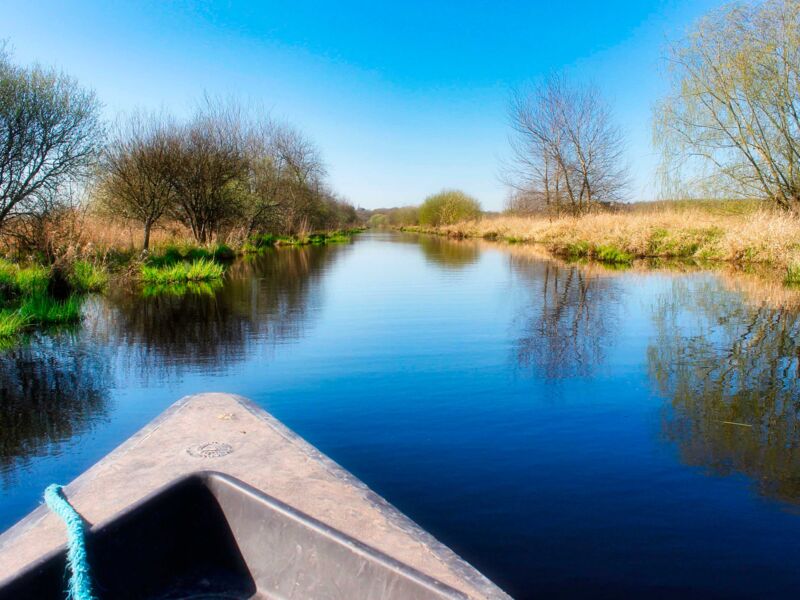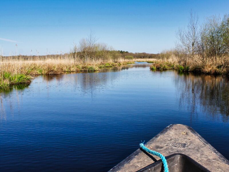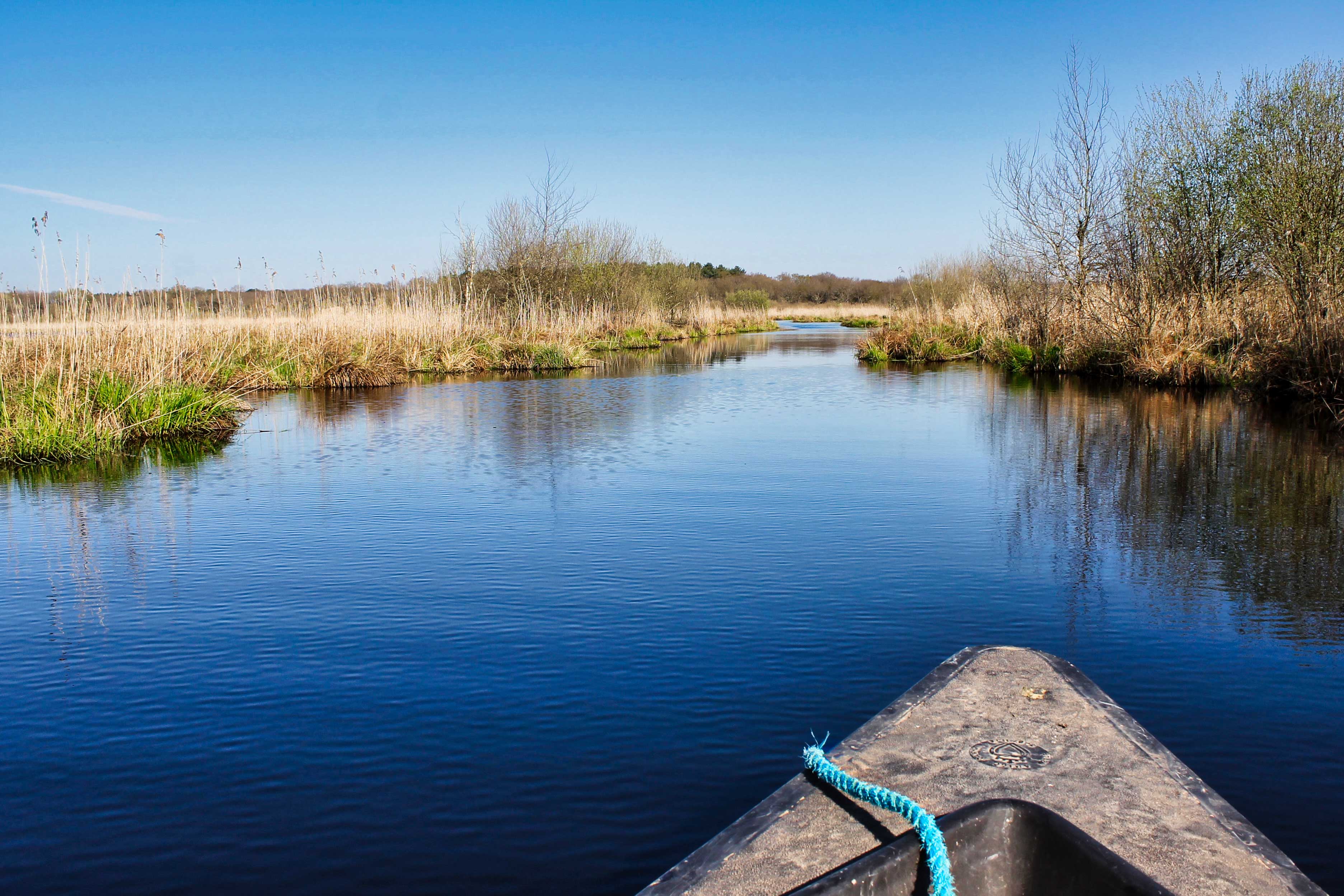 Am nächsten Morgen, nachdem alles aufgeräumt und gepackt war, ging es zu unserem am Vortag gebuchten Kahn. Das Boot war ganz schön groß und zum Steuern gab es schwere Paddel aus Holz. Und kaum vom Ufer abgestoßen haben wir dann gemerkt, wie stark der Gegenwind und die Strömung die Fahrrichtung vom Boot beeinflussen. Seis drum... Romantisch schipperte Gunnar sodann seine Prinzessin mit dem Kahn durch eben dieses Moor.