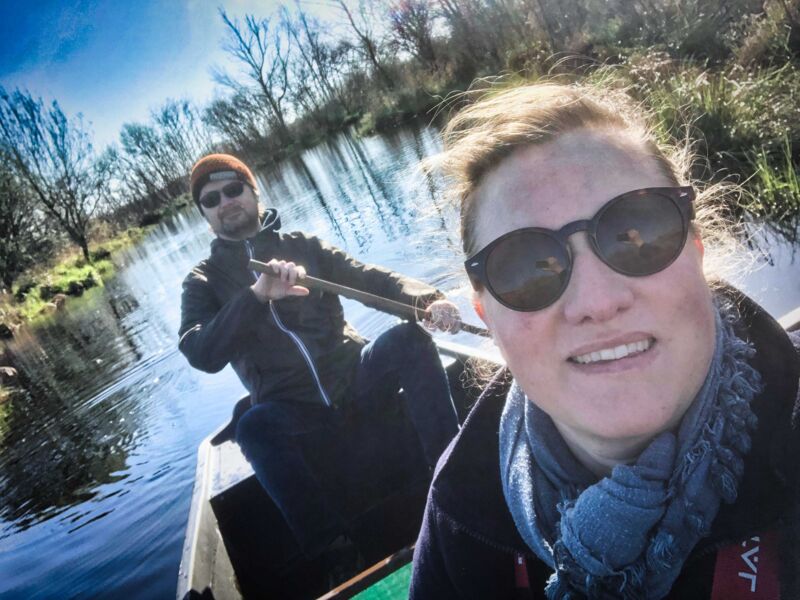 Es gab eine vorgegebene Route, die mit Pfeilen markiert war, damit man im Moor nicht verloren geht. Die so vorgegebene Route sollte 1.5 h dauern. War das ein Kraftakt. Gunnar wollte eigentlich alleine Rudern, aber das ging irgendwann dann nicht mehr. Wir haben beide – teilweise mit voller Kraft – paddeln müssen, um vom Fleck zu kommen und waren heilfroh als wir den Bootsverleih nach knapp 2h wieder vor Augen hatten. Trotzdem war es absolut wundervoll alleine mit der Natur und auf dem Wasser unterwegs zu sein. Man hört nichts ausser den Wind in den Schilfrohren und es war weit und breit kein anderes Boot unterwegs. Natur pur – aus einer ganz besonderen Perspektive.