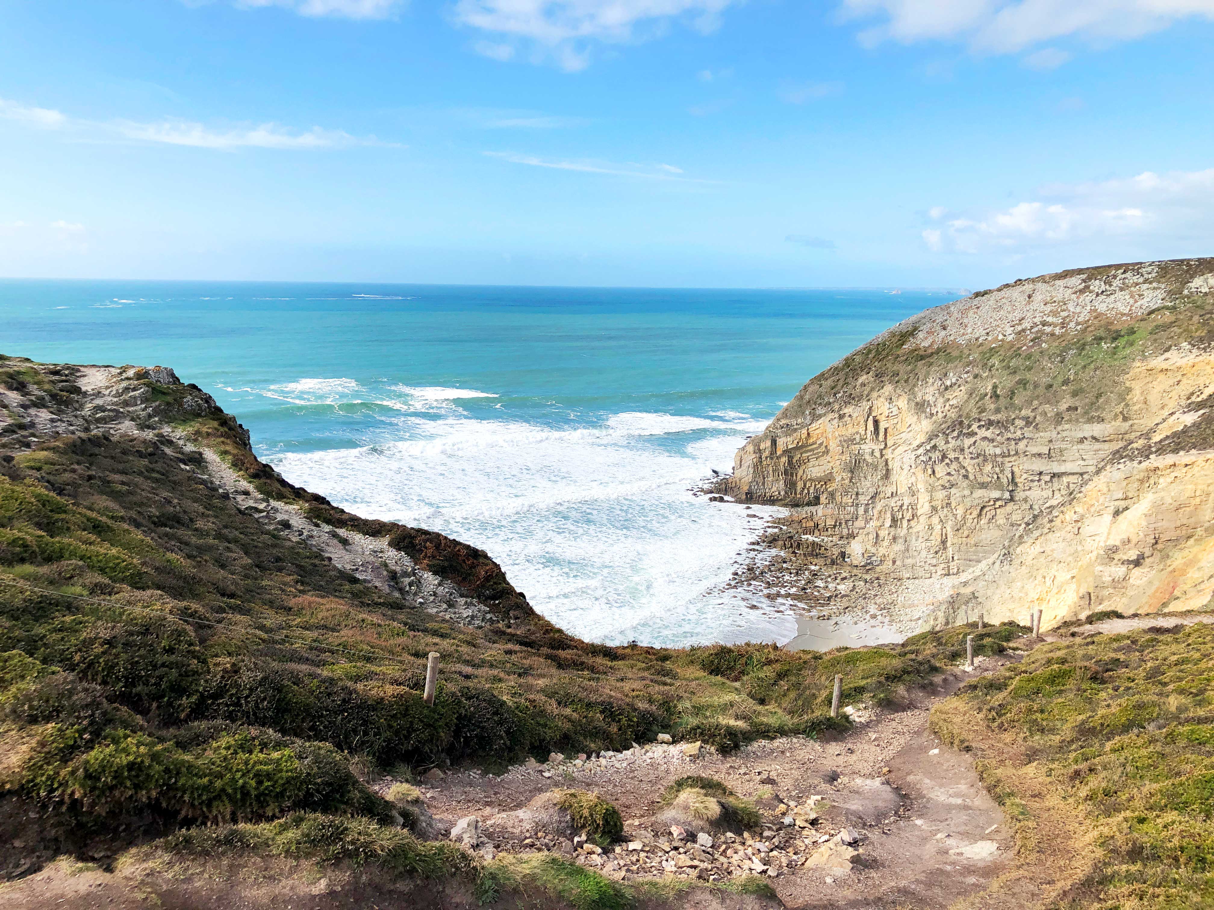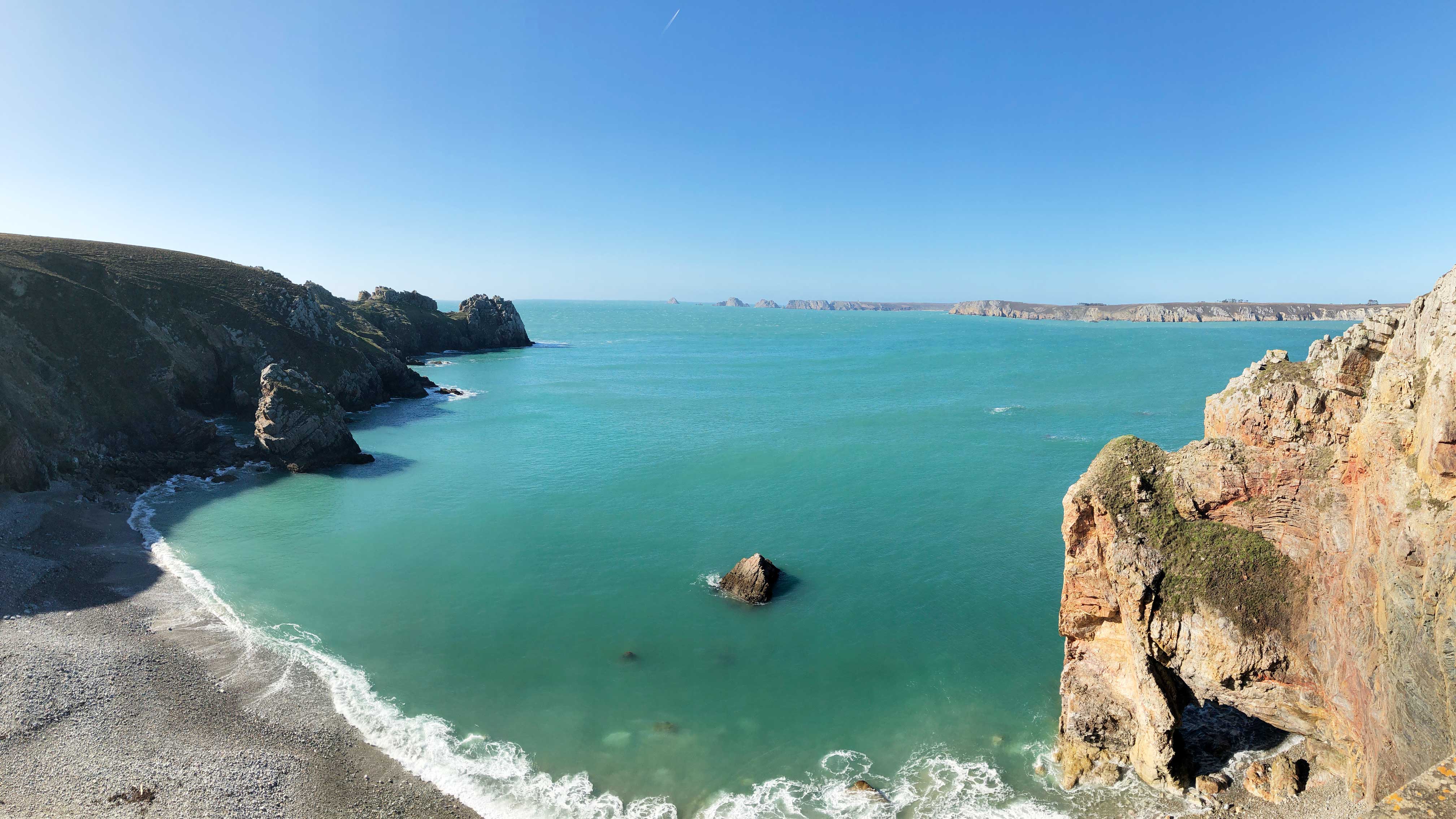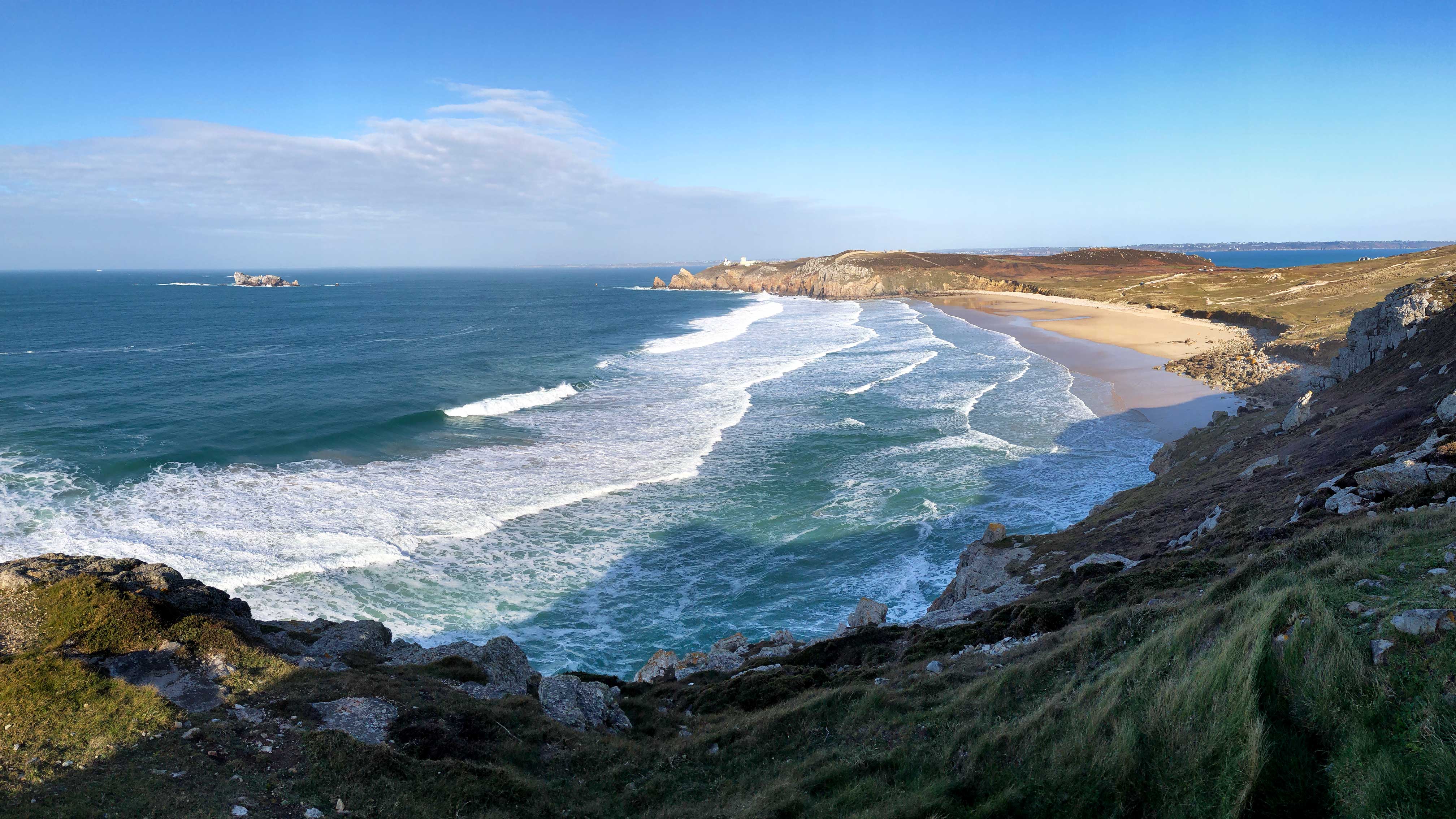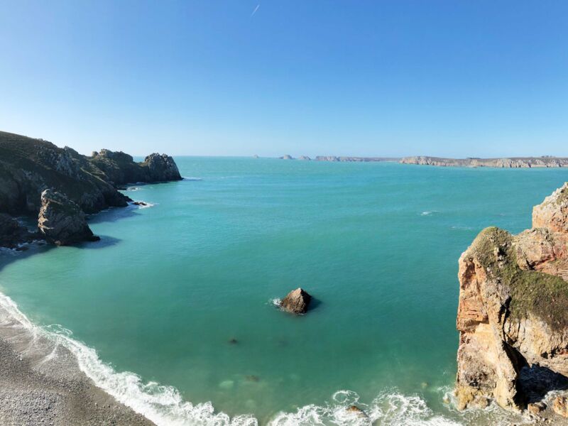 Einmal sind wir jetzt quer durch ganz Finistère gereist. Begeistert hat uns am meisten die Halbinsel von Crozon. Hier gibt es wundervolle kleine Örtchen, Kaps mit Steilküsten – an denen man direkt mit dem Wohnmobil stehen kann und stehen darf. Jeder Geocacher findet hier ein wahres Cacherparadies vor. Und überall führt der hervorragend markierte Küstenfernwanderweg GR 34 direkt an einem vorbei. Auf diesem sind wir nun schon einige Abschnitte gegangen. Auf der Halbinsel Crozon gibt es einen doch recht bekannten Rundwanderweg – ein Teil führt auch den GR 34 entlang – welcher die 3 Kaps Pointe de Pen-Hir, Pointe du Toulinguet und Pointe du Grand Gouin verbindet. Dort kann man Mittags zum Muschelessen in Camaret-sur-Mer einkehren. Nunja, das hatten wir eigentlich vor – leckere Moules frites probieren. Wir hatten natürlich ausgerechnet und nur an diesem Tag, unsere Masken vergessen und mussten hungrig zum Van zurück. „Wer‘s nie im Koppe hat, hat‘s in die Beene“ oder so ähnlich.
