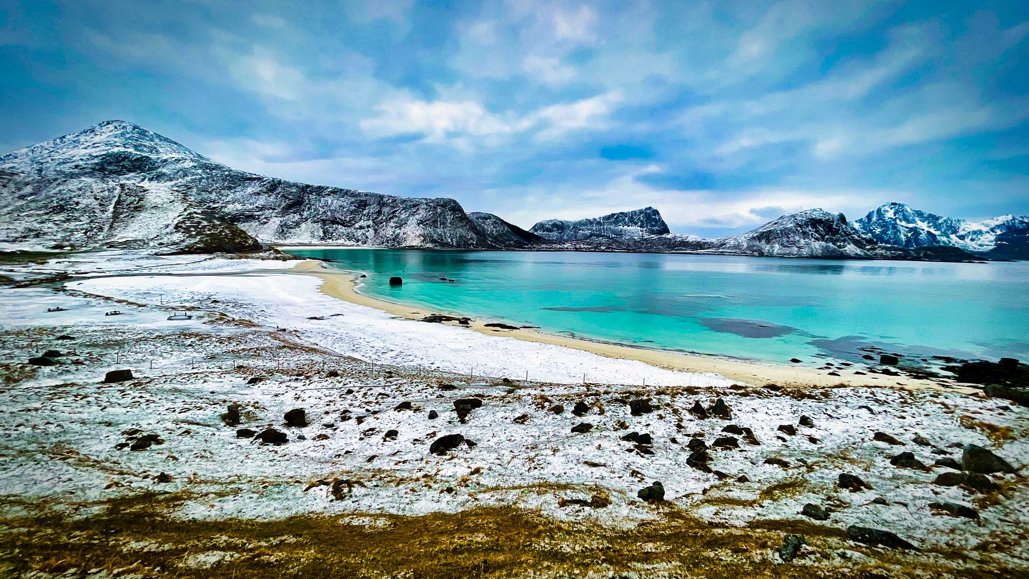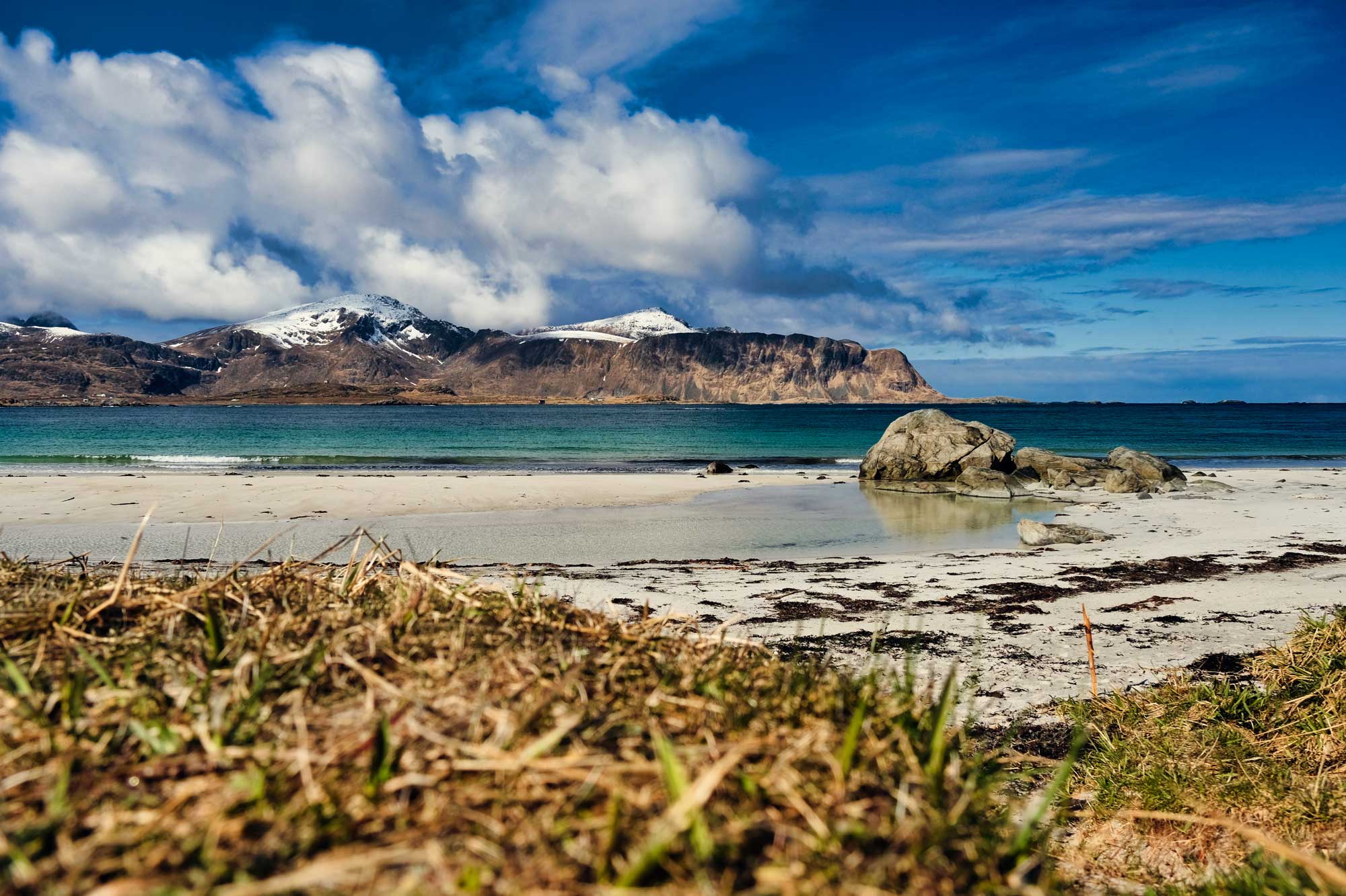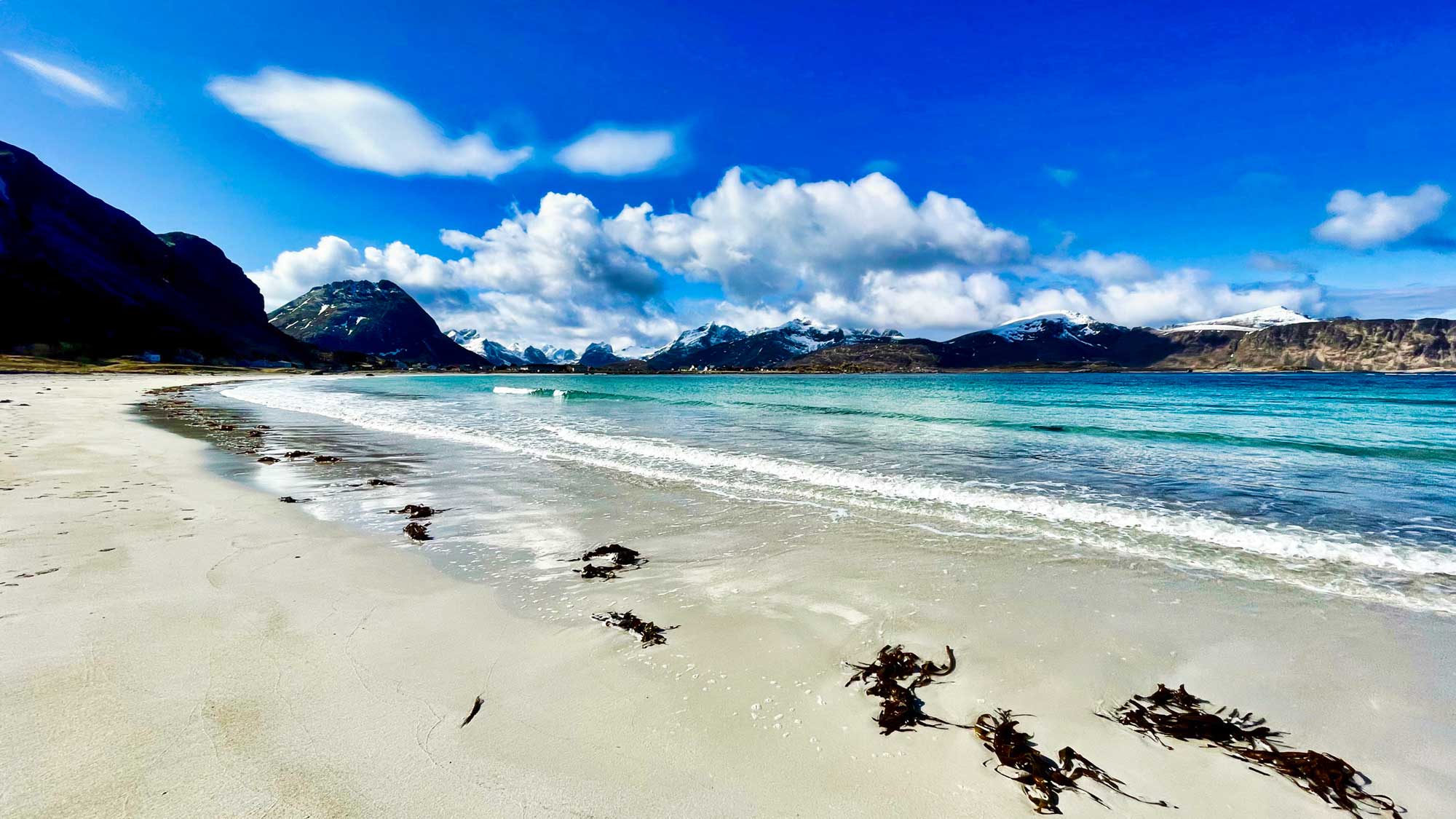 Ein paar Orte weiter kommt auch schon das nächste Highlight, der wohl weißeste Strand der Lofoten in Ramberg – auch ein absolutes Muss. Hier haben wir vor vier Jahren ein totes Walbaby am Strand entdeckt, vielleicht 1,5 m groß. Auch wenn man ja überall liest, dass es hier ganzjährig viele Wale gibt, man bekommt sie ja nicht unbedingt zu Gesicht, aber lebendig im Wasser sind sie uns auch lieber als tot am Strand oder als Fleisch auf dem Sandwich, was es auf den Lofoten durchaus noch zu kaufen gibt.
