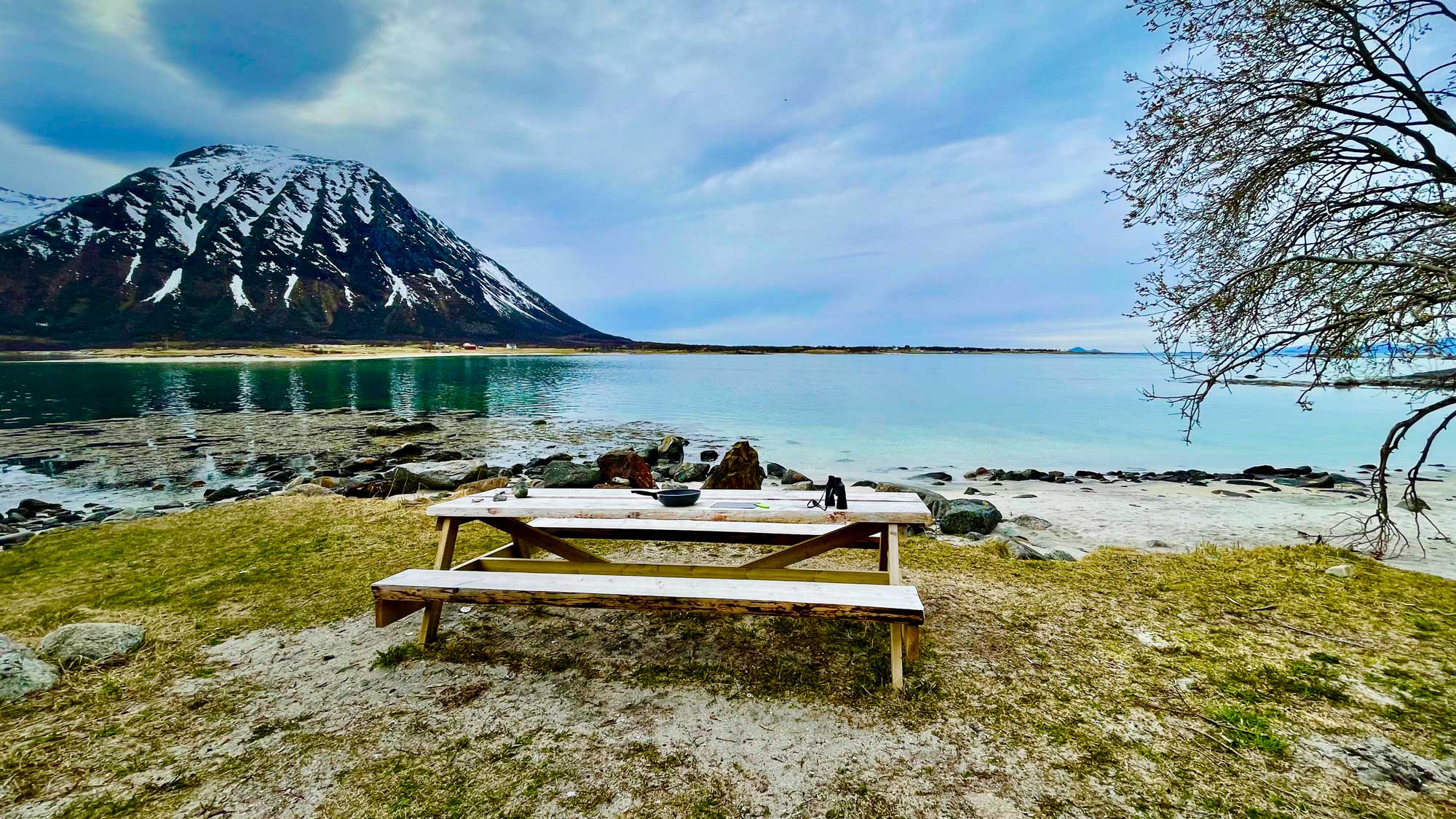 Mittlerweile sind wir im Norden der 3. Insel gelandet und genießen dort die absolute Ruhe an der Fjordstraße Midnattsolveien – der Mitternachtssonnenstraße – und seinen unzähligen Stellplätzen gespickt mit Holzbänken und Tischen sowie Grillplätzen direkt an den Fjorden. Auch dieser Abstecher weg von der E10 hat sich mehr als gelohnt. Gerade ist das Wetter auch so warm, dass wir das erste mal abends draussen kochen und essen konnten, das darf gern häufiger der Fall sein.