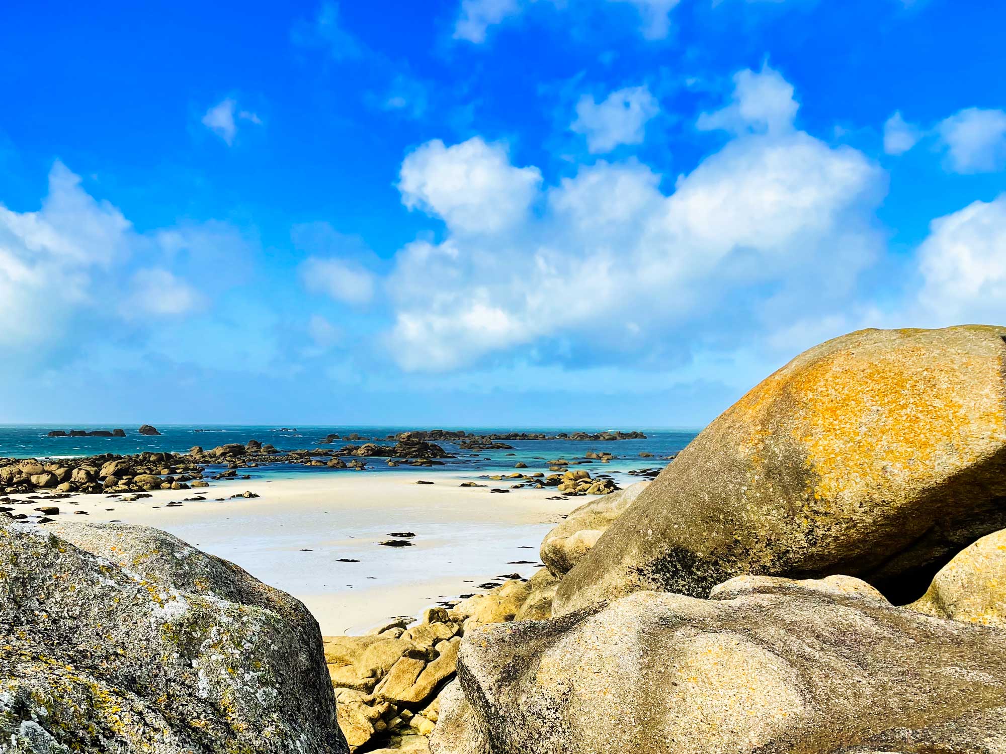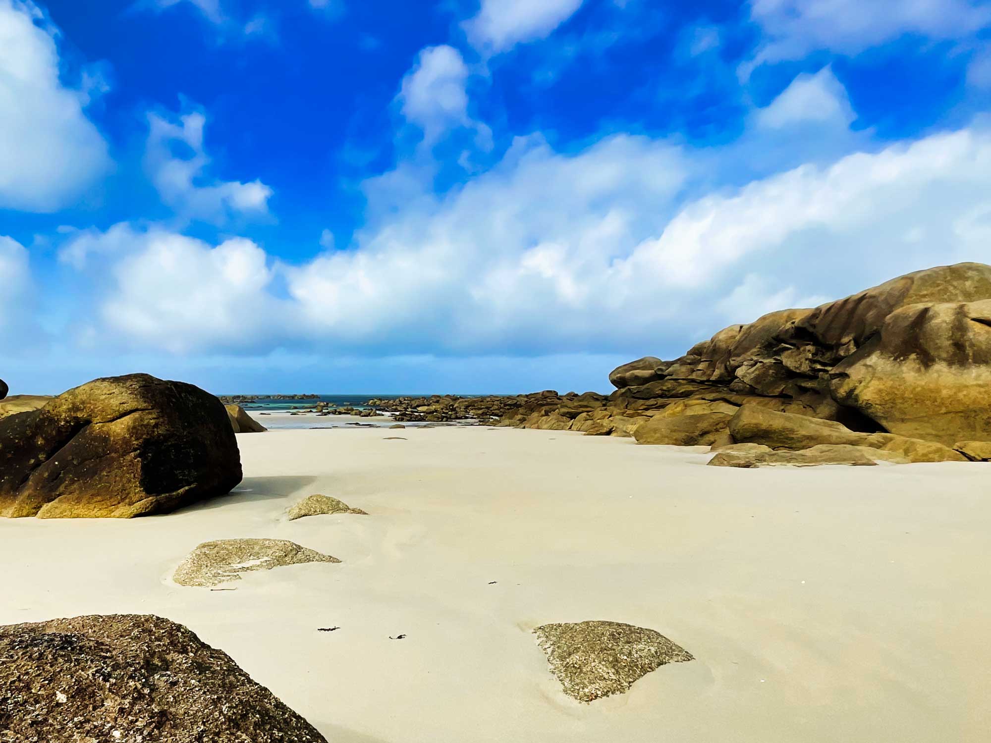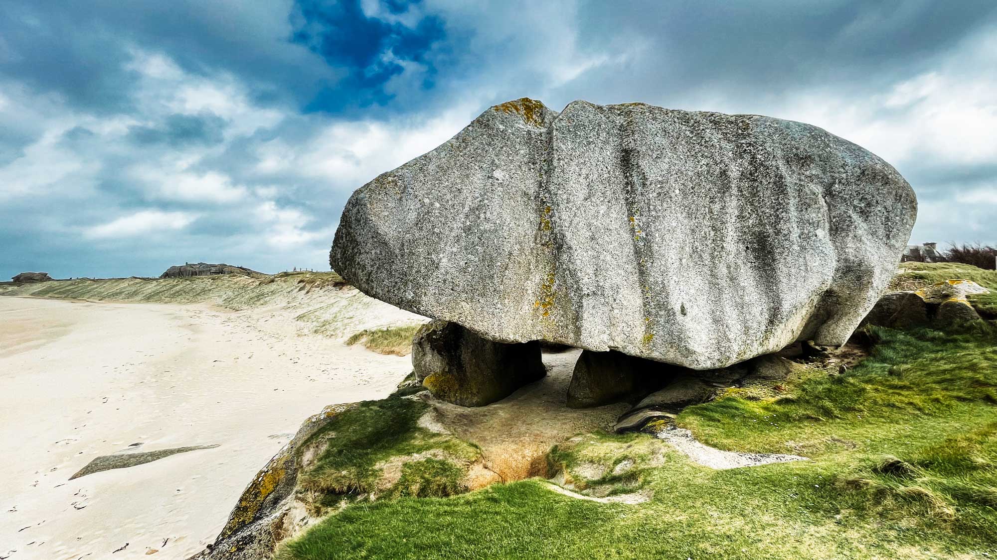 Meneham liegt an der Côte des Légendes, seinen Namen verdankt es der Legende, die besagt, dass die Giganten Spaß daran hatten, Steine ins Wasser zu werfen, die heute diese entlang der Küste verstreuten Kieselsteinhaufen bilden. Und genau das ist der Grund warum es uns hier so gefällt, weiße Strände, türkises Wasser und alles ist voller riesiger Felsbrocken, welche zum Fotografieren und Klettern einladen. Da hatten die Giganten wirklich scheinbar eine Menge Spaß.