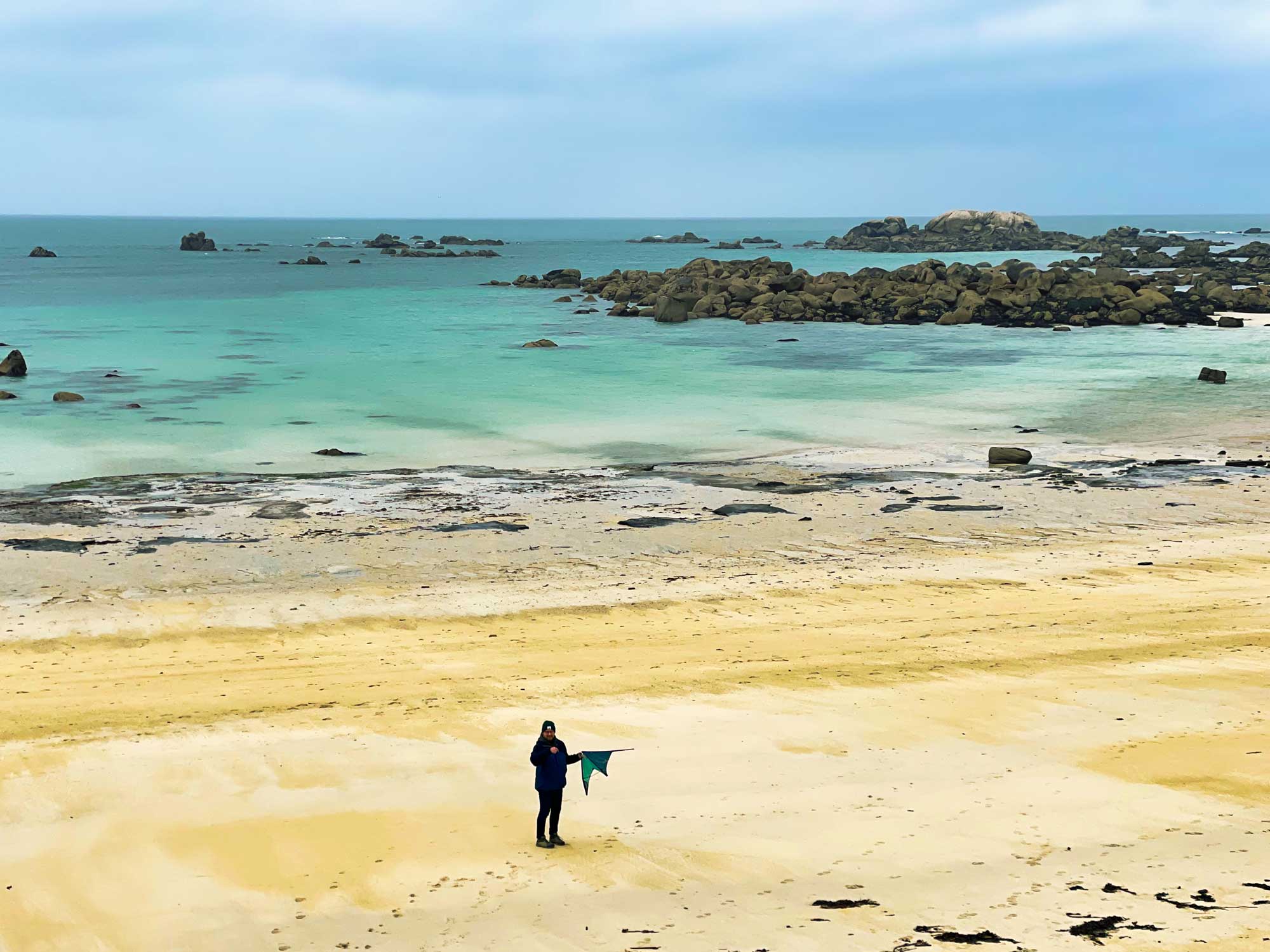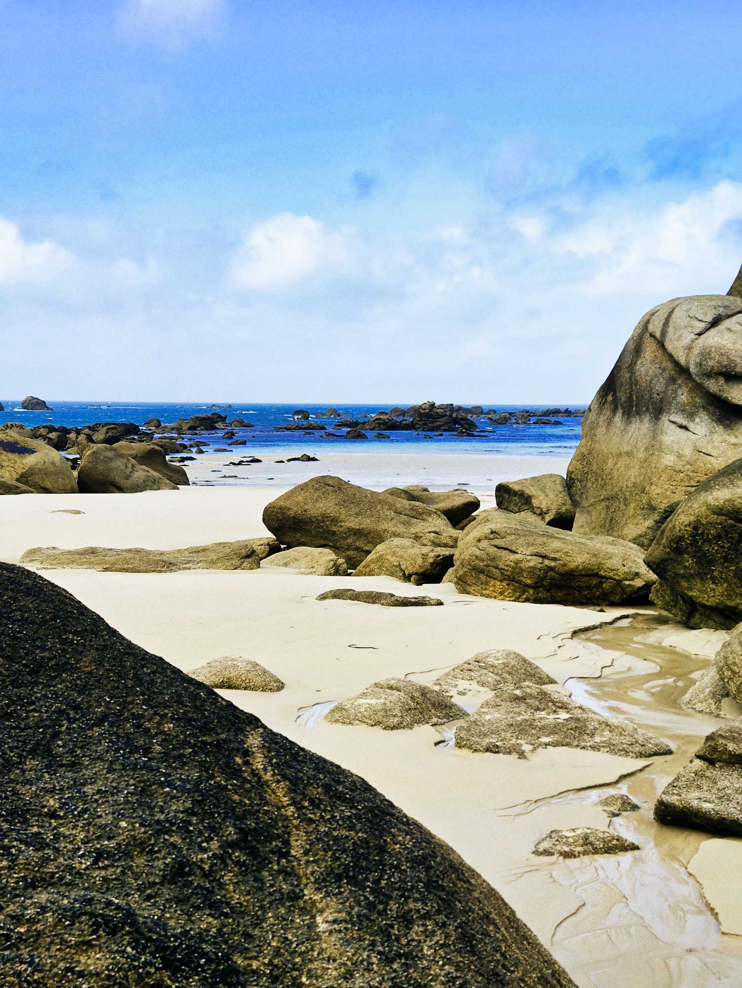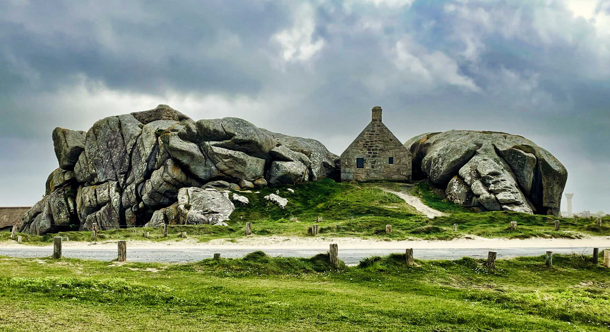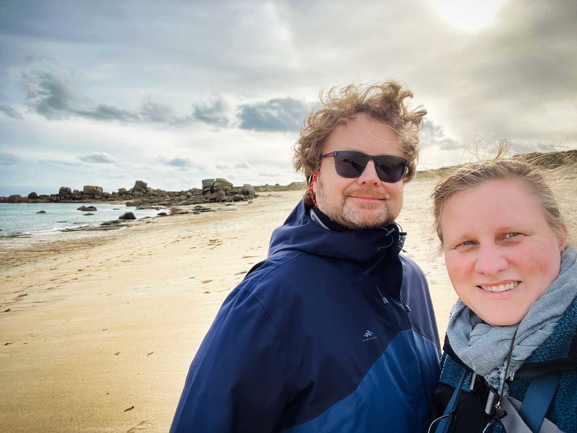 Meneham liegt an der Côte des Légendes, seinen Namen verdankt es der Legende, die besagt, dass die Giganten Spaß daran hatten, Steine ins Wasser zu werfen, die heute diese entlang der Küste verstreuten Kieselsteinhaufen bilden. Und genau das ist der Grund warum es uns hier so gefällt, weiße Strände, türkises Wasser und alles ist voller riesiger Felsbrocken, welche zum Fotografieren und Klettern einladen. Da hatten die Giganten wirklich scheinbar eine Menge Spaß.