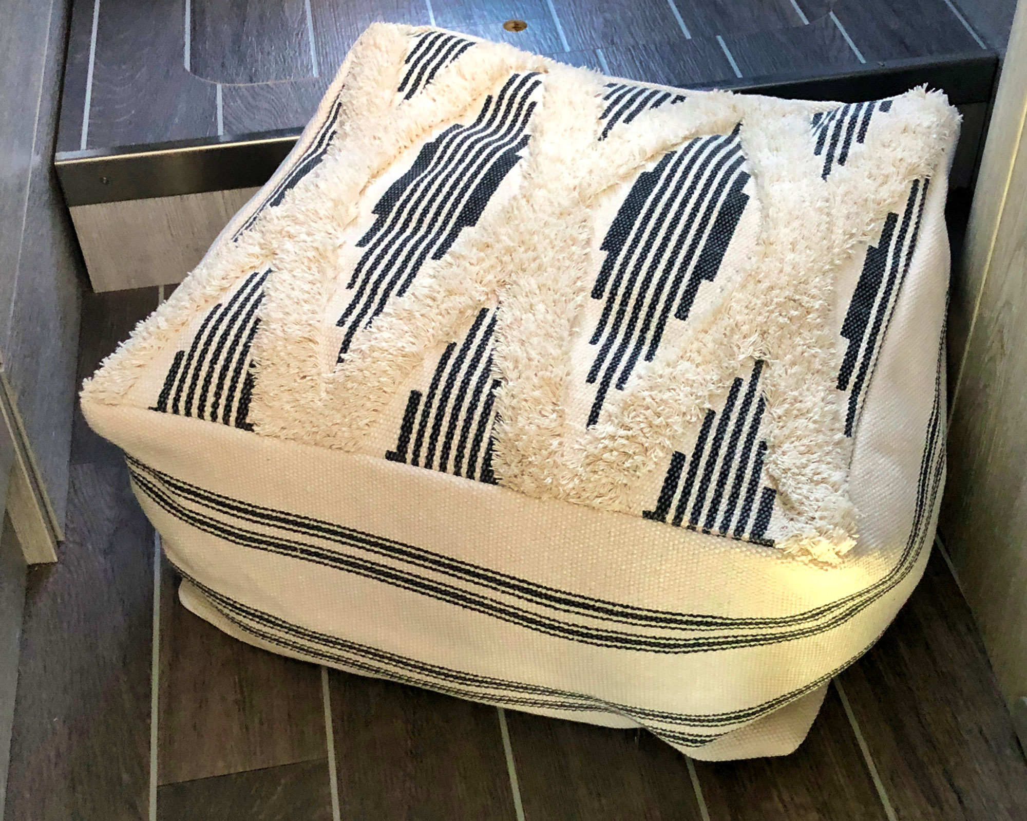 Dann haben wir vor einer Weile bei einem Youtube-Kanal, den wir gerne verfolgen, etwas entdeckt, das wir total clever finden. Das war bei Jessy und Roberto, den Chirpy Travellers. Jessy hat für ihren Van einen Wäsche-Pouf genäht, der gleichzeitig als Fußhocker dient. Wir haben diesmal auf Iris ihre Nähkünste verzichtet und einen bestellt. Dieser beinhaltet bei uns nun erst einmal die Ersatzbettwäsche und dient gleichzeitig noch als Einstiegshilfe ins Bett. Falls er uns doch mal im engen Innenraum stört, ist er ja nur aus Stoff, ist schnell zusammengerollt und unterm Bett verstaut.