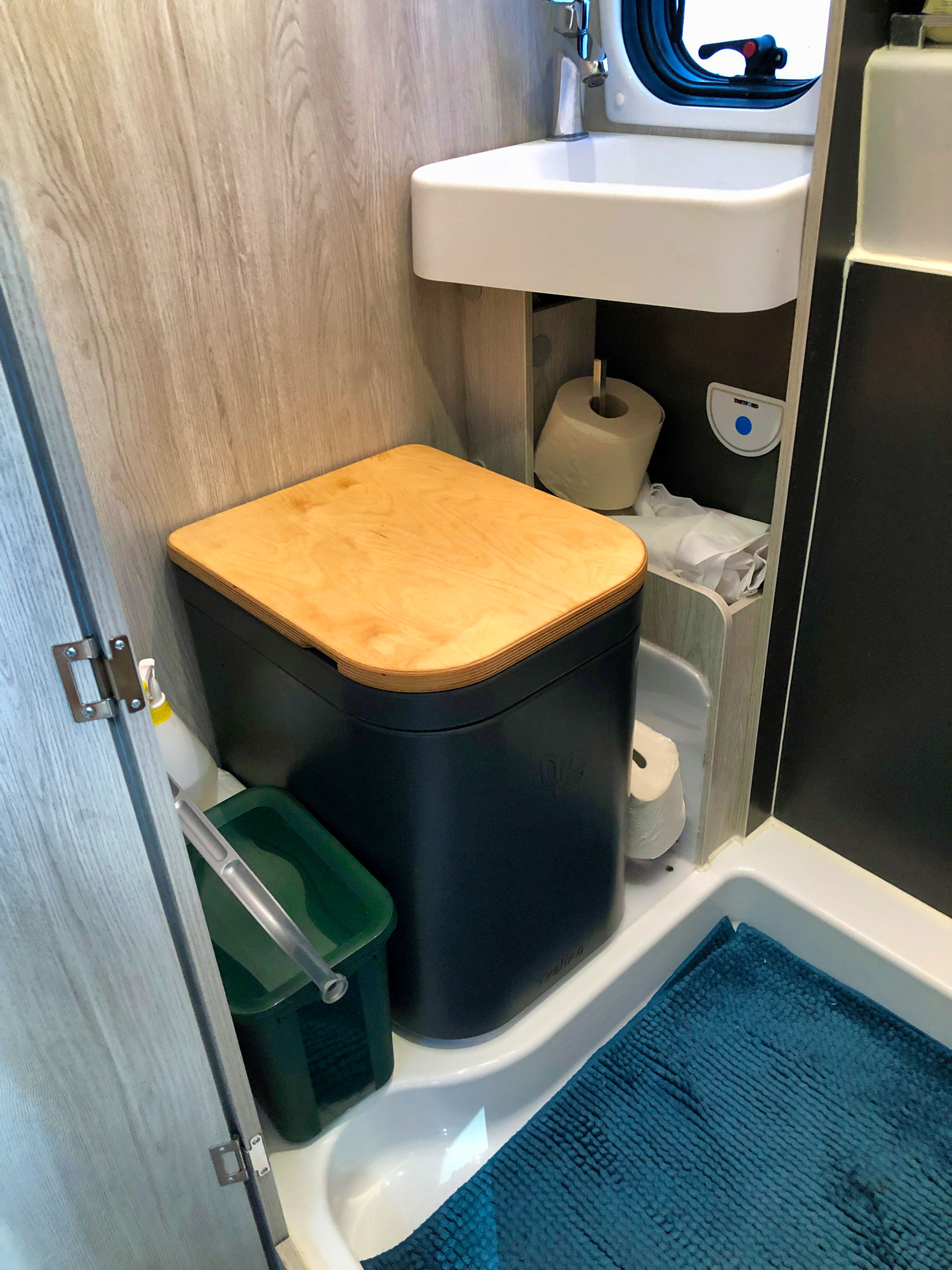 Der neue Stellplatz, Bettentopper und Fliegentür hinten kennst Du ja bereits. Nun haben wir uns auch endlich an den Umbau unserer Chemietoilette in eine Trockentrenntoilette (TTT) gewagt. Und das war ganz schön spannend, schließlich sägt man ja nicht all zu gerne an seinem fast brandneuen Van herum. Wir denken, es hat sich gelohnt. Alle Löcher sind wieder geschlossen, mehr Platz haben wir nun auch im Bad und wie das dann tatsächlich mit der Benutzung werden wird, das werden wir auch gern mit Dir teilen (ohne zu sehr ins Detail zu gehen). Wir haben uns nach einiger Recherche für eine Trelino L in schwarz entschieden. Nicht nur die vielen positiven Bewertungen sprechen für dieses Modell, sondern auch die Größe der Behälter, wir wollen ja so selten wie möglich entsorgen müssen. Selbstverständlich wurde die Trelino fachmännisch fest installiert. Sie ist mit zuschaltbarer SOG-Entlüftung ausgestattet und zum putzen auch leicht wieder komplett herausnehmbar.