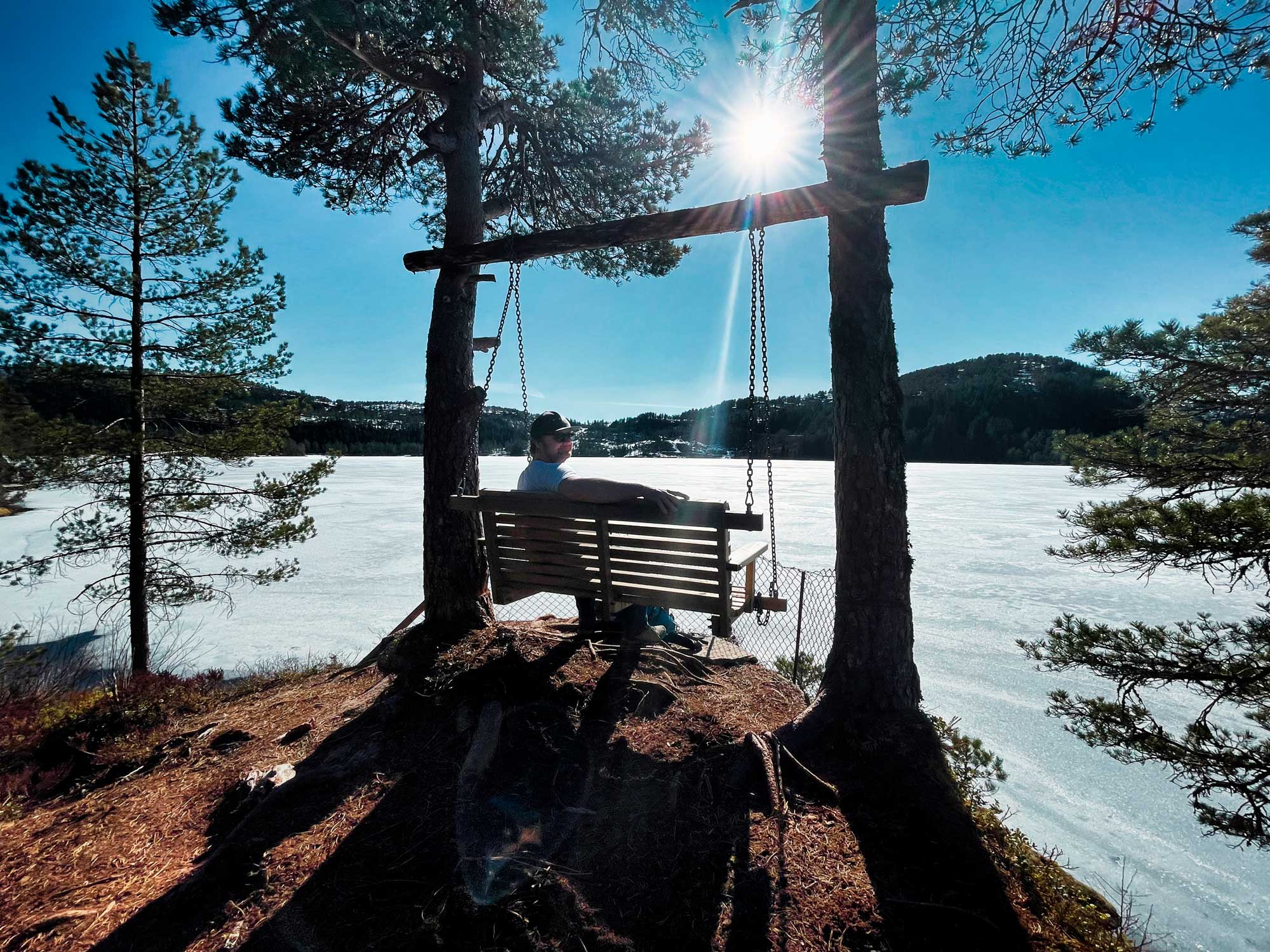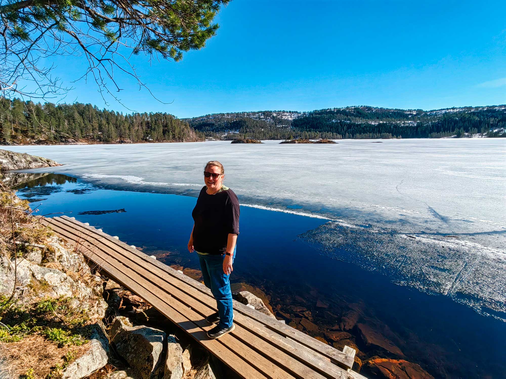 Damit wir bei dem vielen Autofahren nicht einrosten, haben wir uns schließlich eine auf den ersten Blick absolut machbare Rundwanderung um einen See herausgesucht. Wir parkten auf einem Stellplatz auf der Sonnenseite des noch teilweise zugefrorenen Sees und haben einiges an Lehrgeld gezahlt. Gunnar ist ja echt fit, ihm hat die Wander-Tortour nicht so viel ausgemacht. Ich bin hingegen weit über meine Grenzen hinausgegangen und hätte, wenn es möglich gewesen wäre, die Wanderung mehrmals abgebrochen. Aber möglich war das nicht, wie wir dann nach der Hälfte der Strecke festgestellt hatten. Der erste Teil der Strecke ging über Stock und Stein, wunderschön aber auch schon sehr anstrengend. Der Weg war liebevoll angelegt mit vielen Holzstegen, mehreren Schaukeln und vielen tollen Sitzgelegenheiten. Als wir auf der anderen Seite angekommen waren, war ich ehrlich gesagt schon körperlich durchaus ausgelastet. Der zweite Teil des Rundwegs verlief allerdings im Schatten und war deshalb fast durchgehend mit Schnee bedeckt, bzw. mit Eisplatten und ging direkt am zugefrorenen See entlang, dessen Eis allerdings auch nicht mehr tragfähig war. Insgesamt über 4 Stunden haben wir gebraucht für gerade mal 6km. Immer wieder neue Landzungen hielten uns davon ab endlich am Ziel anzukommen. Und als wir endlich unseren Buddy in Sichtweite hatten war ich komplett überfordert. Ich bin danach ohne Essen direkt ins Bett und hatte am nächsten Tag den Muskelkater des Jahrhunderts. Die Lehre haben wir gezogen: Im Frühling in Norwegen gibt es stellenweise noch sehr viel Schnee. Und nur zur Info es sind uns zwei Joggerinnen entgegengekommen, die das ganze im Laufschritt absolviert haben. Tiefster Respekt.